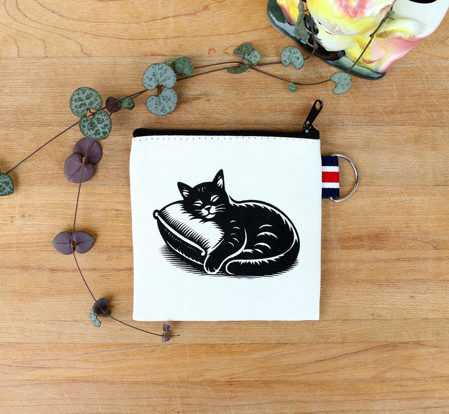 A 4 1/2 x 4 3/4 inch, off-white, canvas, coin purse that has been screen printed with a cute, napping cat. It is a cute little pouch that you can carry your change, credit cards and lip gloss in. Also great as a gift card holder.